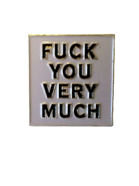 “Fuck You Very Much” in black block letters on white background rectangular gold metal enamel pin