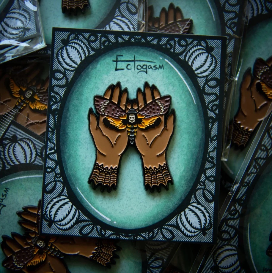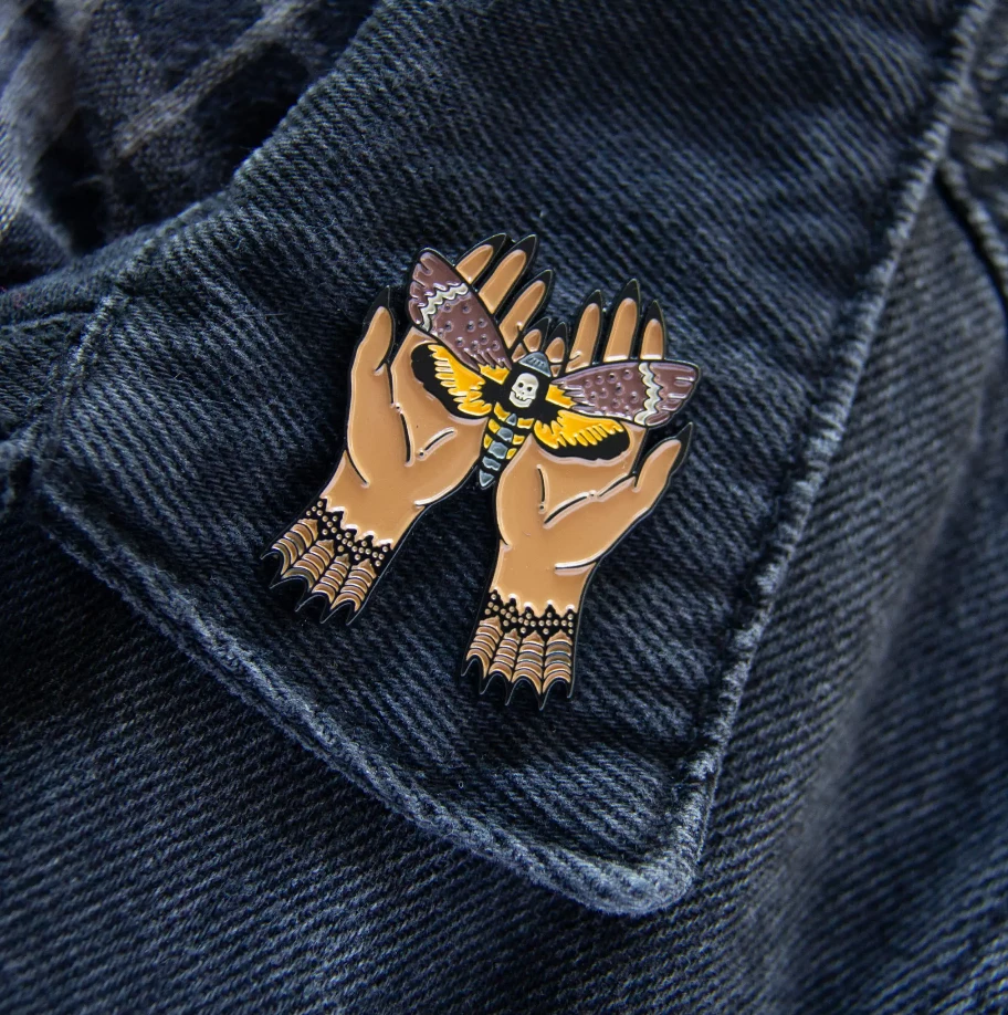 Death’s Head Moth gently held in witchy hands enameled metal double clutch back fastener pin. Original design by artist Ectogasm.