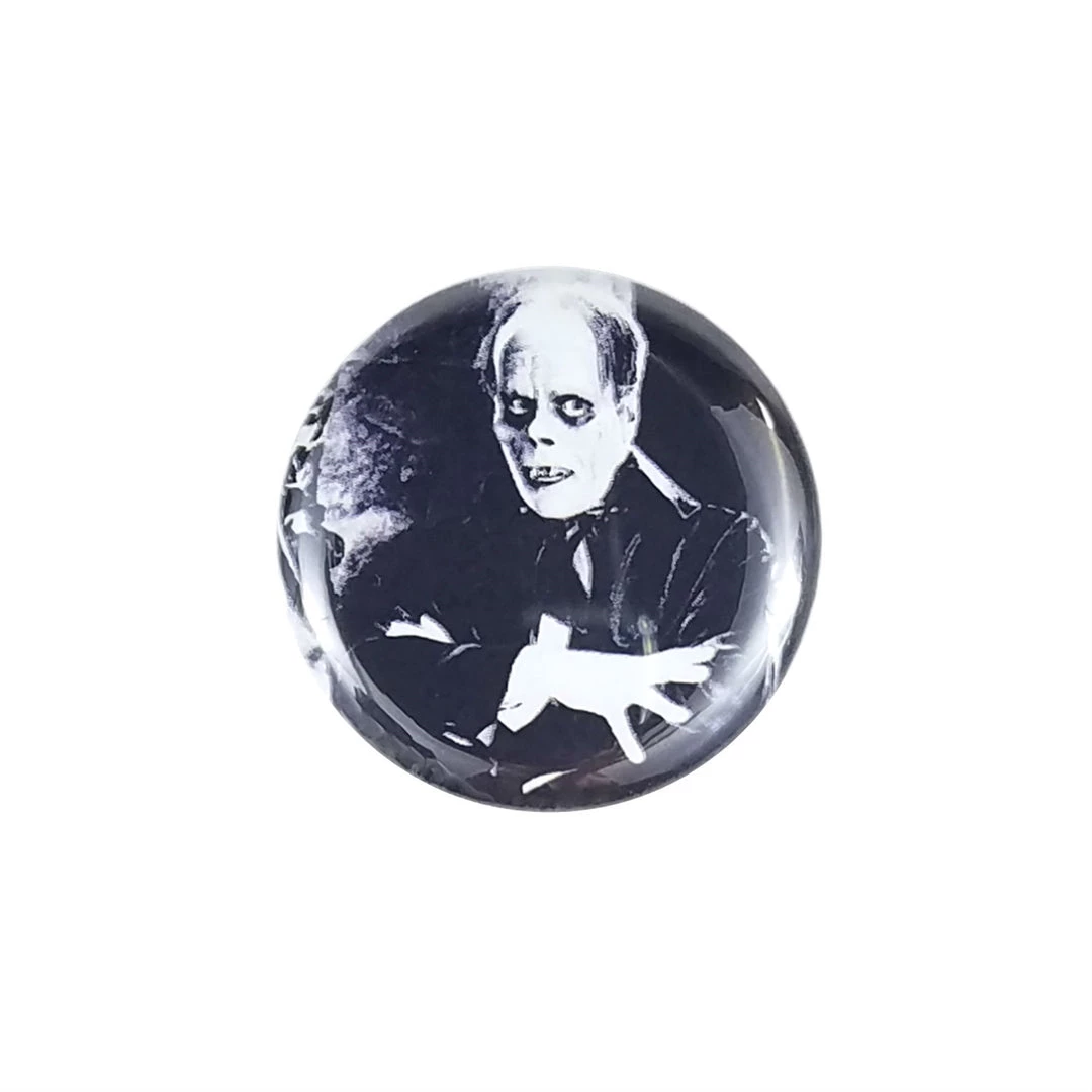 The Phantom of the Opera Button shows Lon Chaney, the “Man of a Thousand Faces,” as his iconic role in the 1925 silent horror classic.