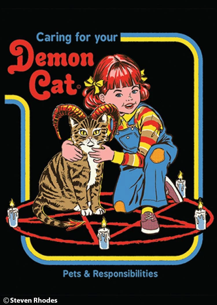 Steven Rhodes Sinister 70s “Caring for your Demon Cat” Pets & Responsibilities book cover style illustrated rectangular refrigerator magnet, made by Ephemera