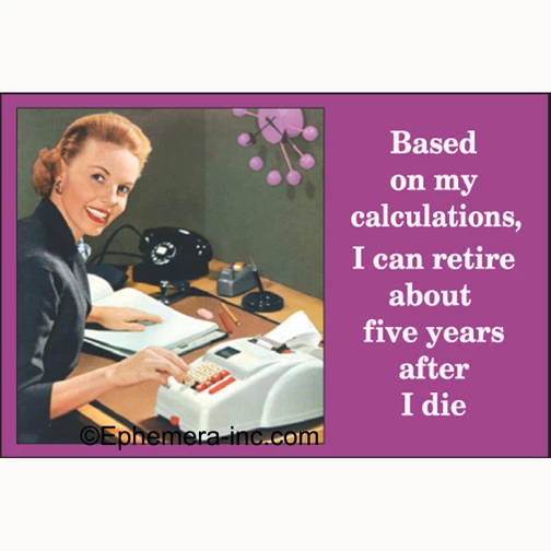 “Based on my calculations, I can retire about five years after I die” rectangular refrigerator magnet
