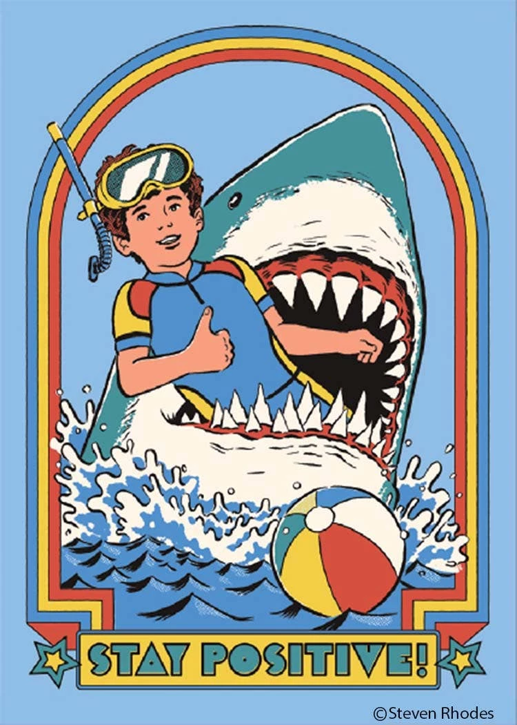 Steven Rhodes Sinister 70s “Stay Positive” illustrated rectangular refrigerator magnet, made in the U.S.A. by Ephemera