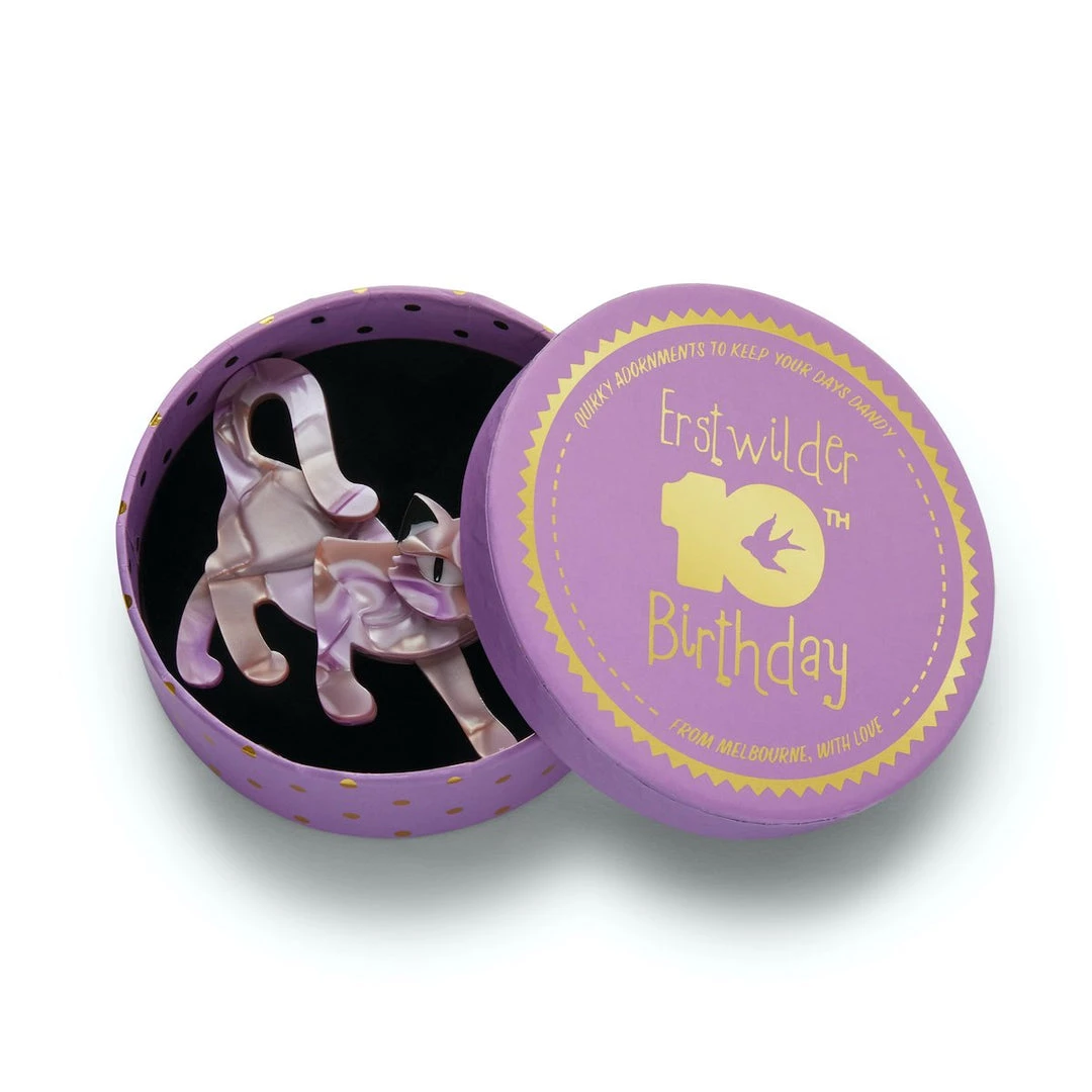 Erstwilder 10th Birthday Fan Favourites Collection “Taming Tamara” kitty brooch. All Erstwilder designs are original and made from layered resin and are limited in production–once they’re gone, they’re gone forever! All metal components are made from a lead and nickel free base-metal.