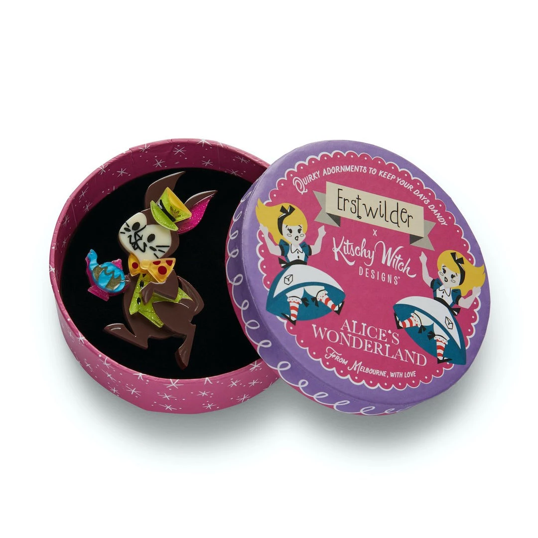 Kitschy Witch Designs Alice’s Wonderland collaboration collection “The March Hare” brooch, made by Erstwilder. All designs are original and made from layered resin and are limited in production–once they’re gone, they’re gone forever! All metal components are made from a lead and nickel free base-metal.
