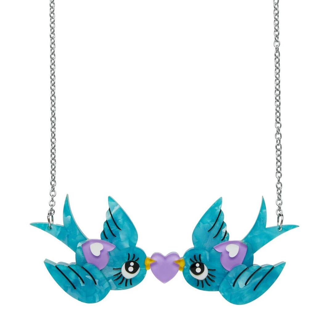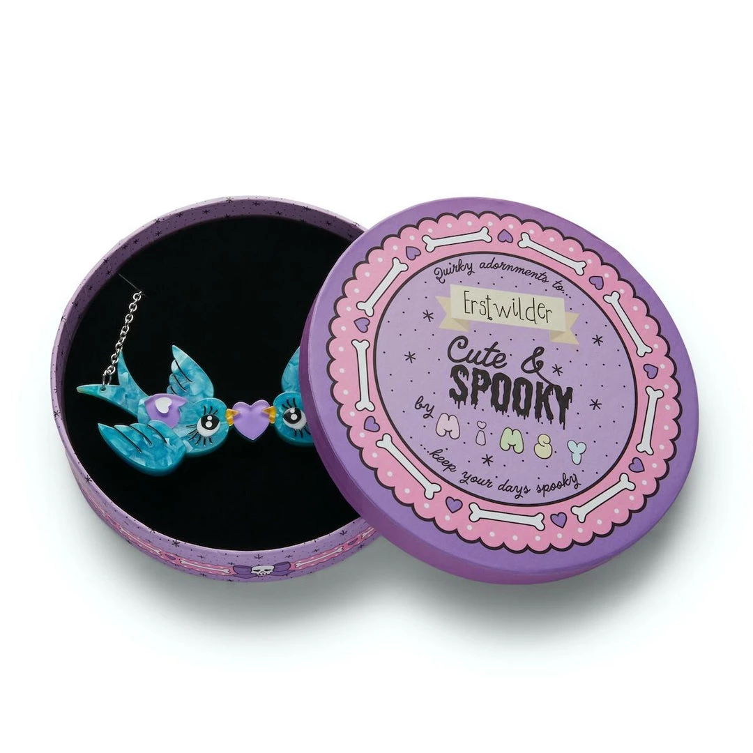 Cute & Spooky by Mimsy Gleeson collaboration collection “Piper and Pal” blue lovebirds with purple heart statement necklace, made by Erstwilder. All designs are original and made from layered resin and are limited in production–once they’re gone, they’re gone forever! All metal components are made from a lead and nickel free base-metal.