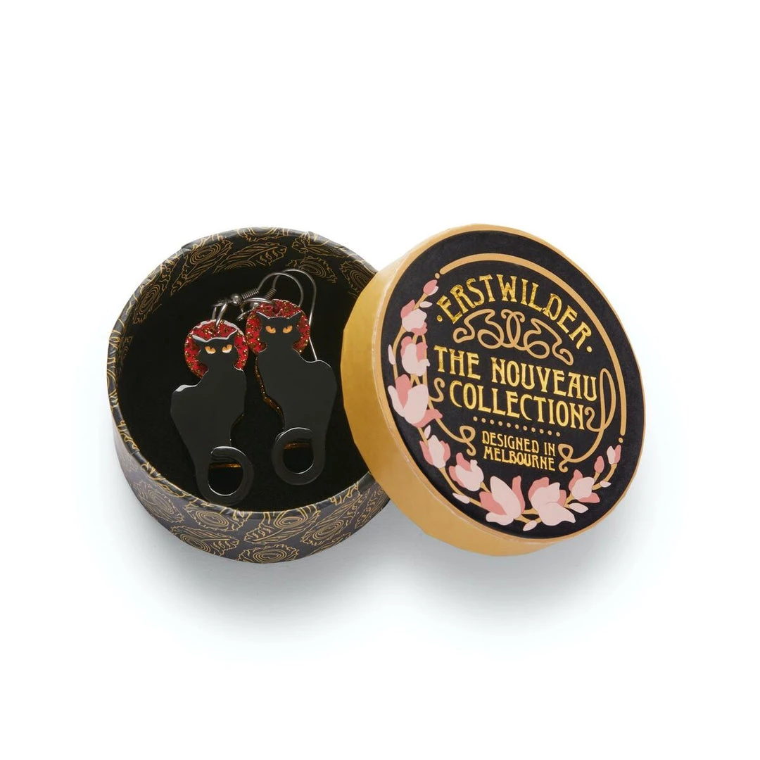 Art Nouveau Collection “Le Chat Noir” sleek cats layered resin dangle earrings, designed in Australia by Erstwilder. All designs are original and limited in production, so once they’re gone, they’re gone forever! All metal components are now stainless steel.