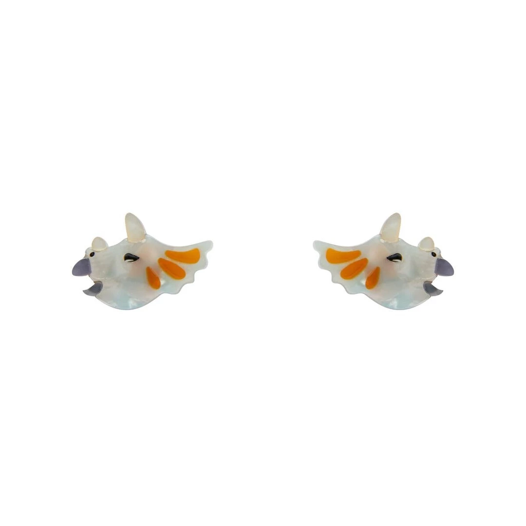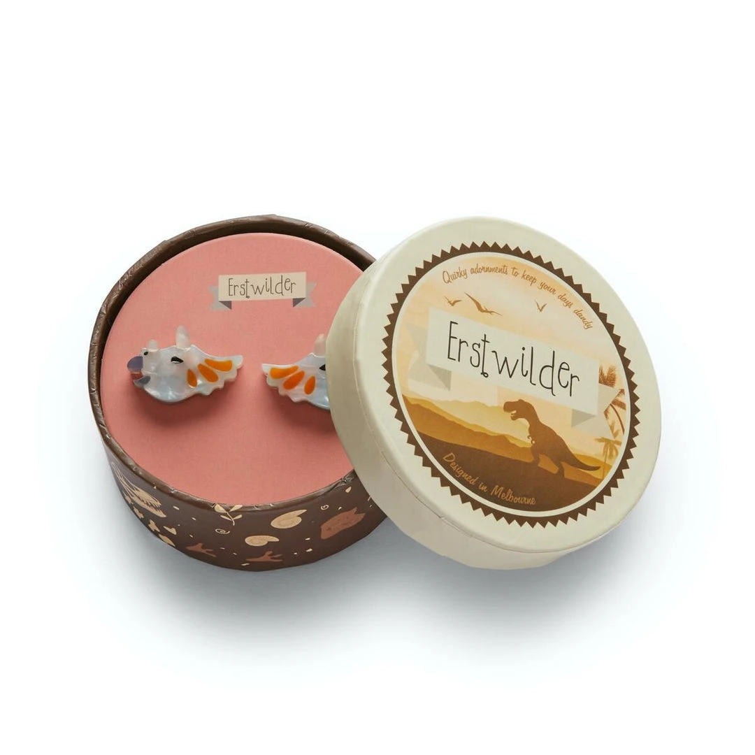 Dinosauria Collection “Tricera-Pop” post earrings, designed in Australia by Erstwilder. All designs are original and made from layered resin and are limited edition–once they’re gone, they’re gone! All metal components