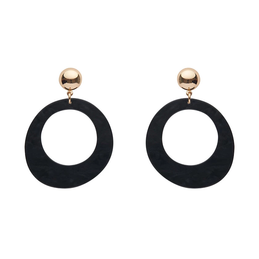 Essentials Collection black ripple texture 100% Acrylic resin circle suspended from a shiny gold metal dome post drop earrings, designed in Australia by Erstwilder.