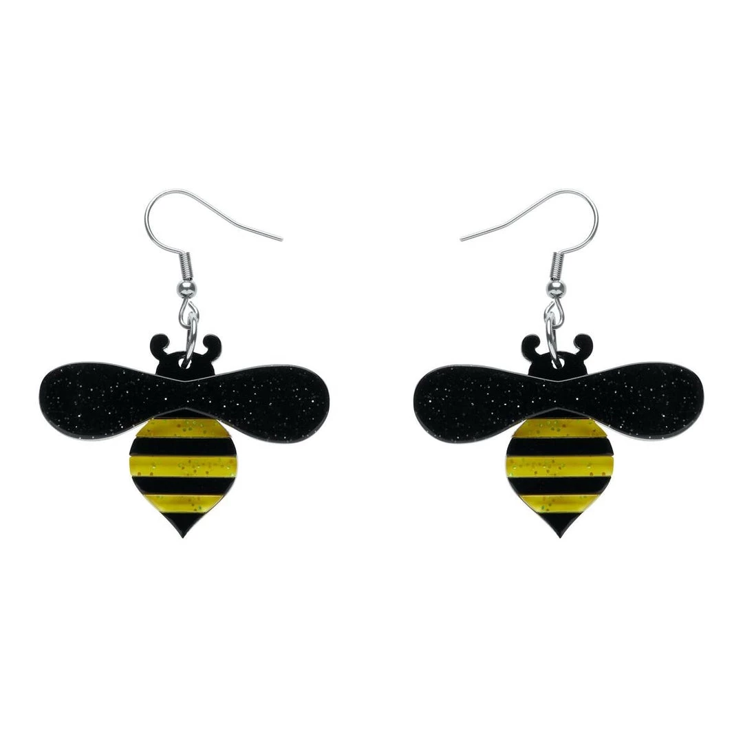 Fan Favourites Collection “Babette Bee” glittery black & yellow layered resin dangle earrings, designed in Australia by Erstwilder. All designs are original and limited in production–once they’re gone, they’re gone forever!