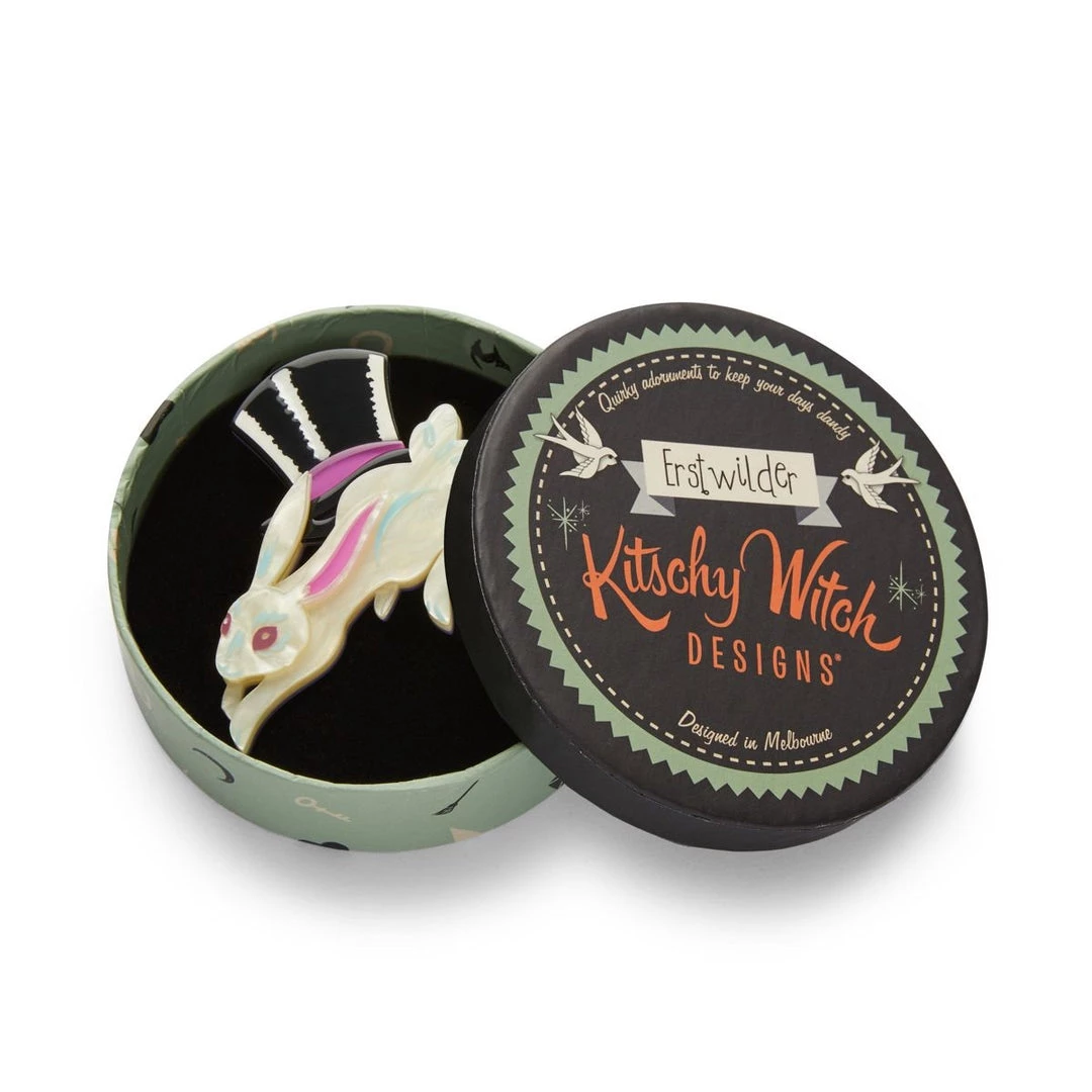 Kitschy Witch Designs collaboration collection “Hat Trick” brooch, made by Erstwilder. All designs are original and made from layered resin and are limited in production–once they’re gone, they’re gone forever! All metal components