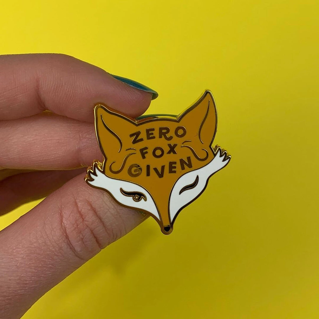 Liz Harry Collection “Zero Fox Given” enameled gold metal clutch back pin, made by Erstwilder