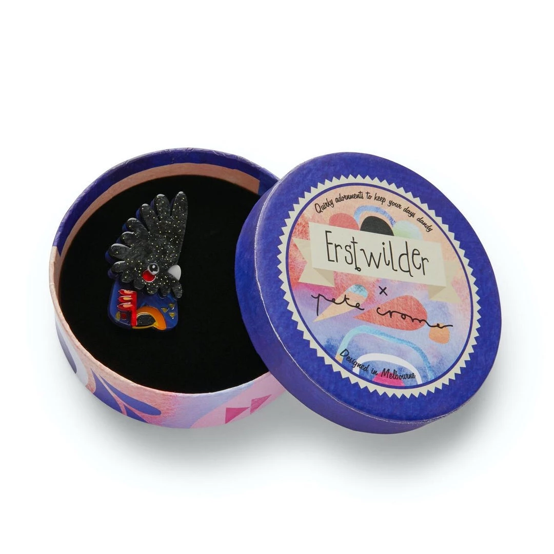 Pete Cromer x Erstwilder Collaboration Collection “The Rare Red-Tail Cockatoo” layered resin mini brooch, designed in Australia. All designs are original and limited in production–once they’re gone, they’re gone forever!