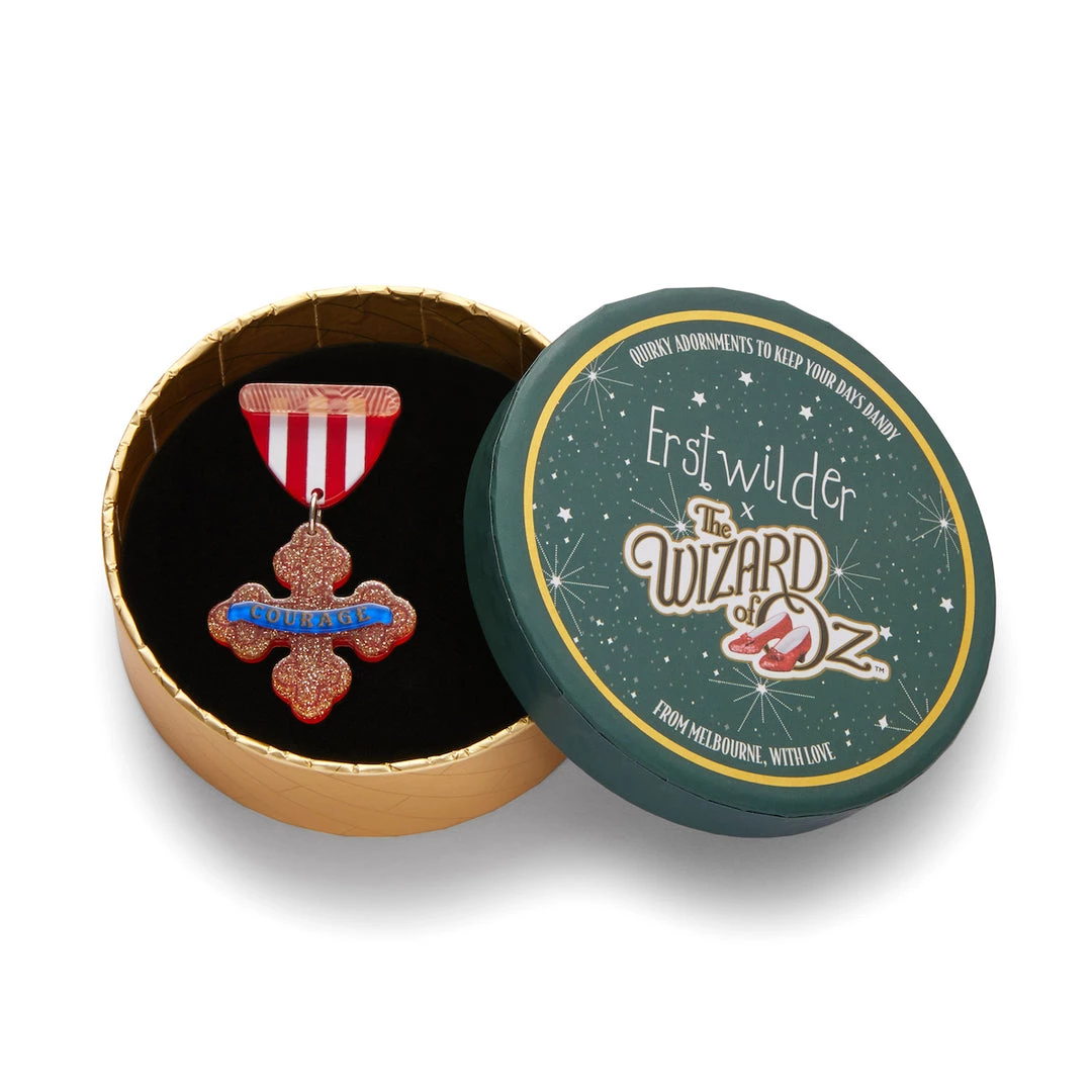 Wizard of Oz Collection “Medal of Bravery” brooch, designed in Australia by Erstwilder. All designs are original and made from layered resin and are limited edition–once they’re gone, they’re gone! All metal components are made from a lead and nickel free base-metal.