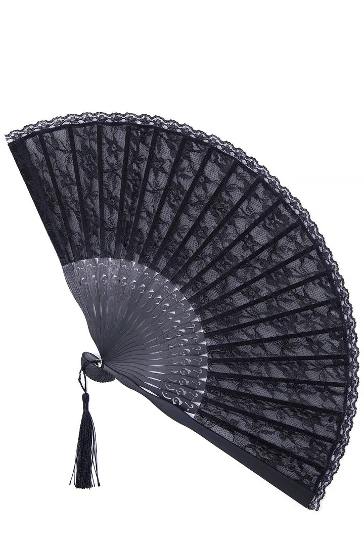 Dark and lovely 9″ “Oxana” black lace on sheer black fabric folding fan with decorative cut-out black bamboo wood ribs and attached black tassel –perfect for punctuating dramatic gestures, or just beating the heat!