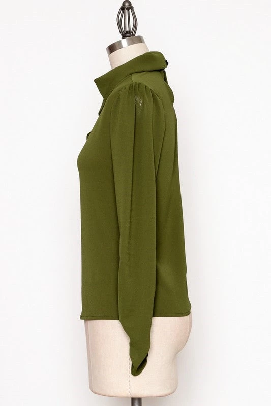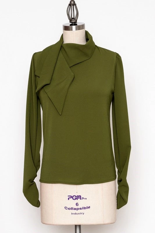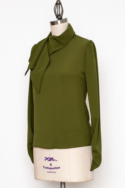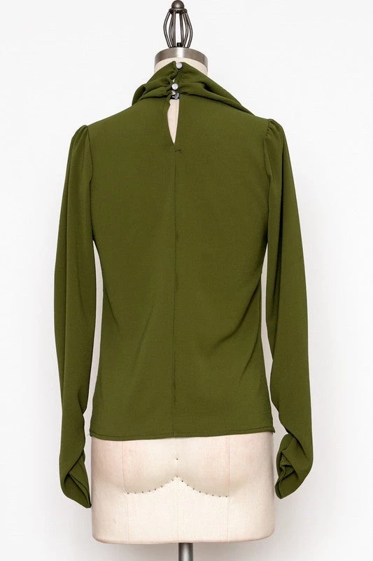 Lovely olive green long sleeve stretch polyester crepe blouse with asymmetrical draped collar that gathers and fastens with three pearly buttons at the nape –perfect for pairing with pencil skirts or trousers