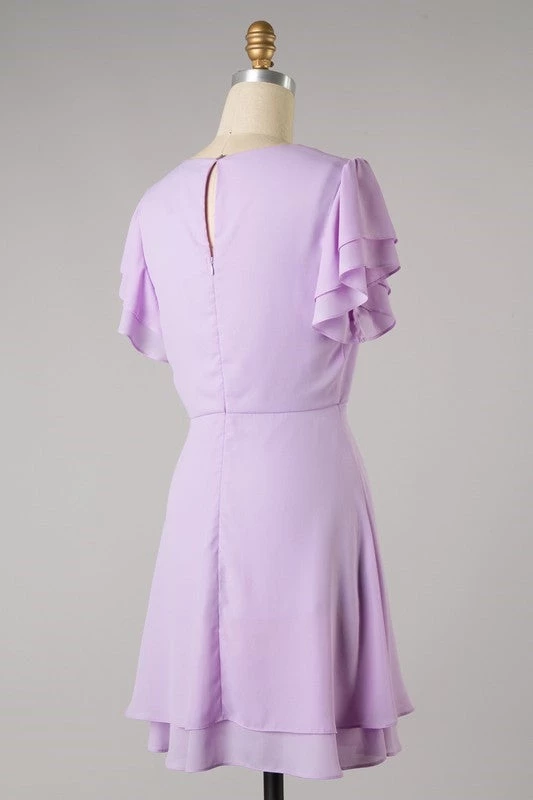 So pretty! Flirty Lilac chiffon fit & flare dress featuring short flutter sleeves, high lightly gathered neckline, layered above the knee length skirt, and keyhole opening at the nape.