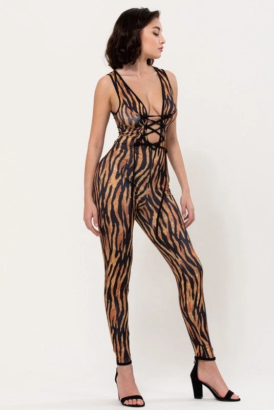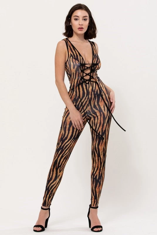 Me-Ow!! This sleeveless stretch knit tiger print catsuit with plunging lace-up front bodice is ready for slinking around town, and purr-fect for anyone who uses “Poison Ivy would wear it” as criteria for wardrobe choices! 😉