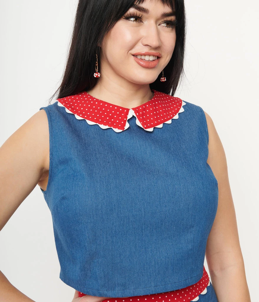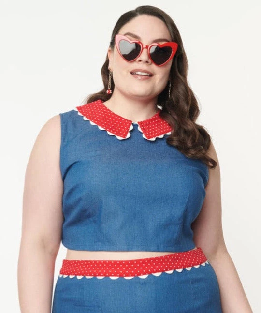 The Bold Times crop top by Unique Vintage is a darling retro style shell top in blue stretch faux denim with a red and white dotted collar and white ric rac trim detail. With buttons up the back, the perfect amount of stretch and darts for shaping, it’s perfect for pairing with your favorite high-waisted shorts or a swing skirt for a sweet and breezy summer look!