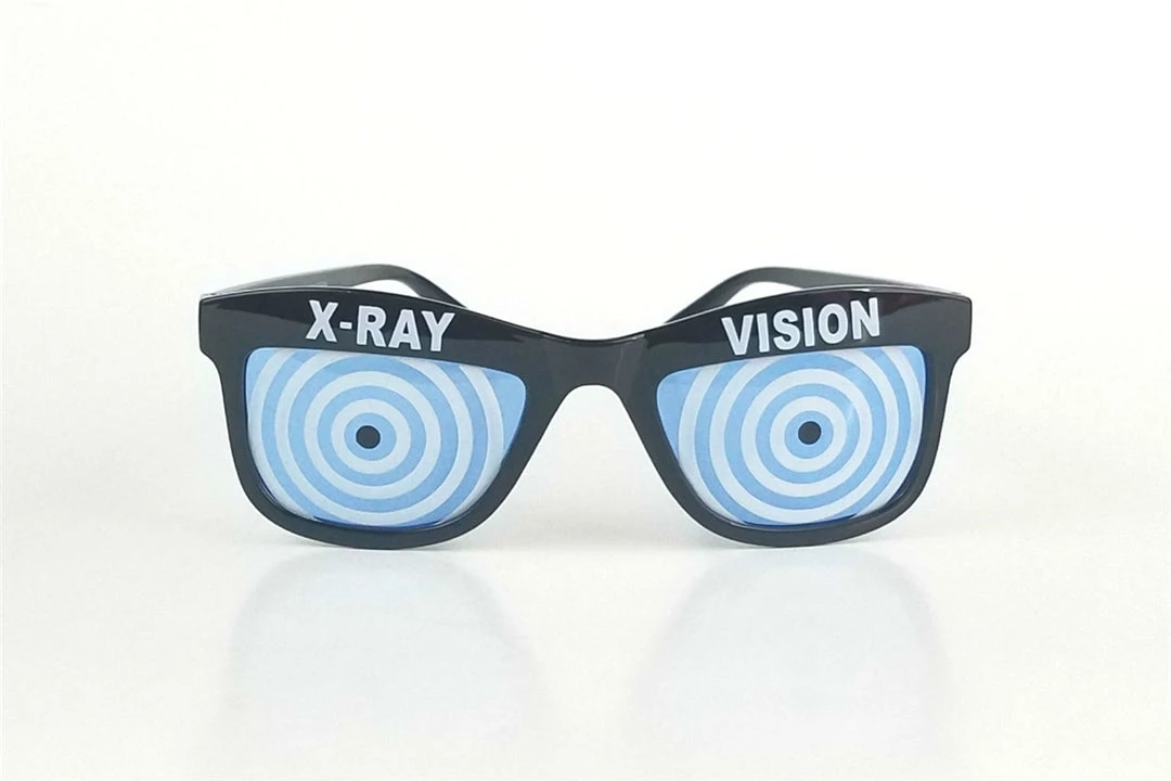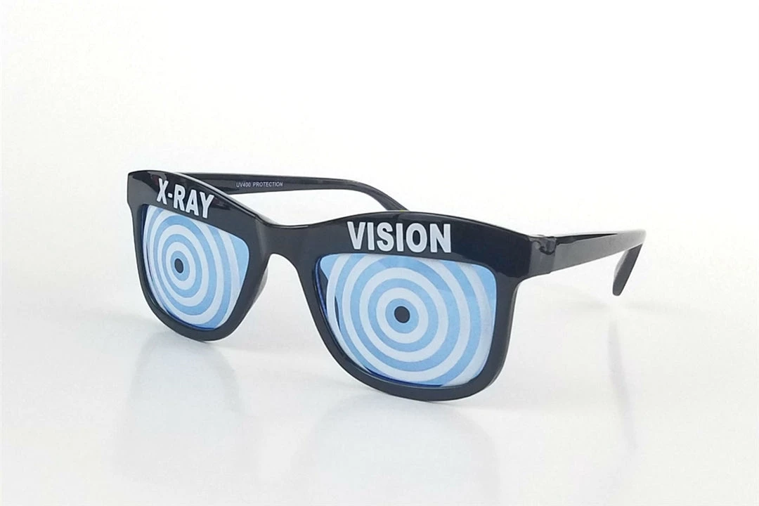 Back of the comics ad classics! See “living skeletons” instantly when you don these blue lens x-ray vision novelty black plastic frame sunglasses–REALLY, these deliver truth-in-advertising results on a par with Sea Monkeys!!