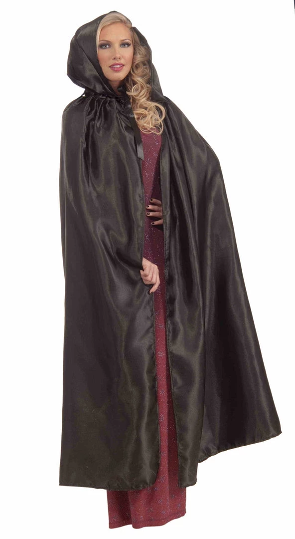 Dramatic long black polyester satin hooded cape with tie closure in black–a great costume topper for spooky looks