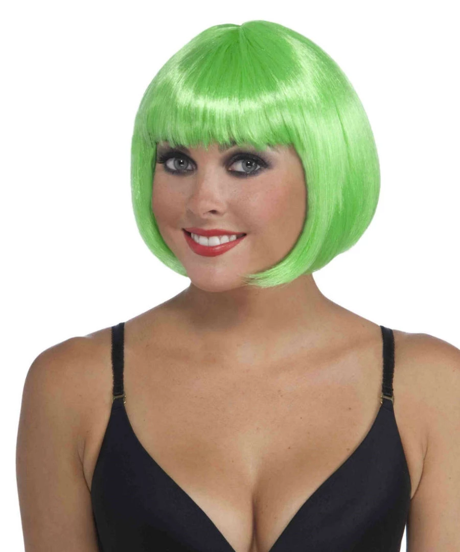 Shiny bright neon green straight chin length bob cut wig with bangs–a great costume accessory, or just fun for a night out!