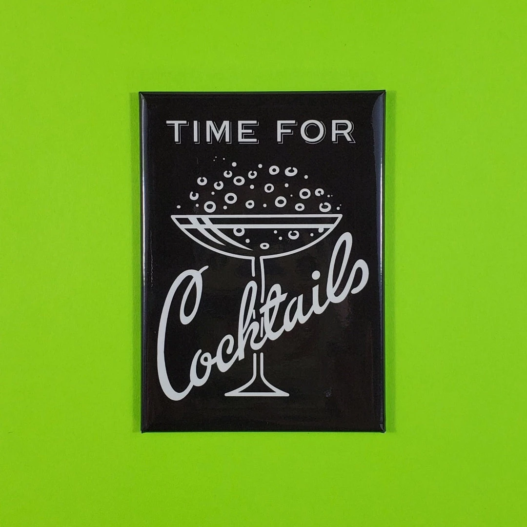 Black with white vintage “Time for Cocktails” with glass of bubbly illustrated image rectangular refrigerator magnet, made in the U.S.A. by Fridgedoor