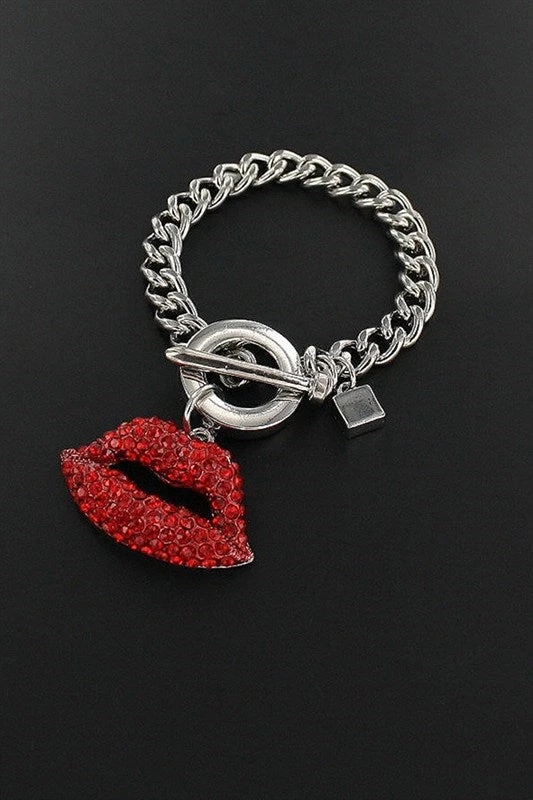 This sassy bracelet features a pair of sparkly red rhinestone-encrusted lips dangling from a shiny silver chain with a nail-shaped toggle clasp.