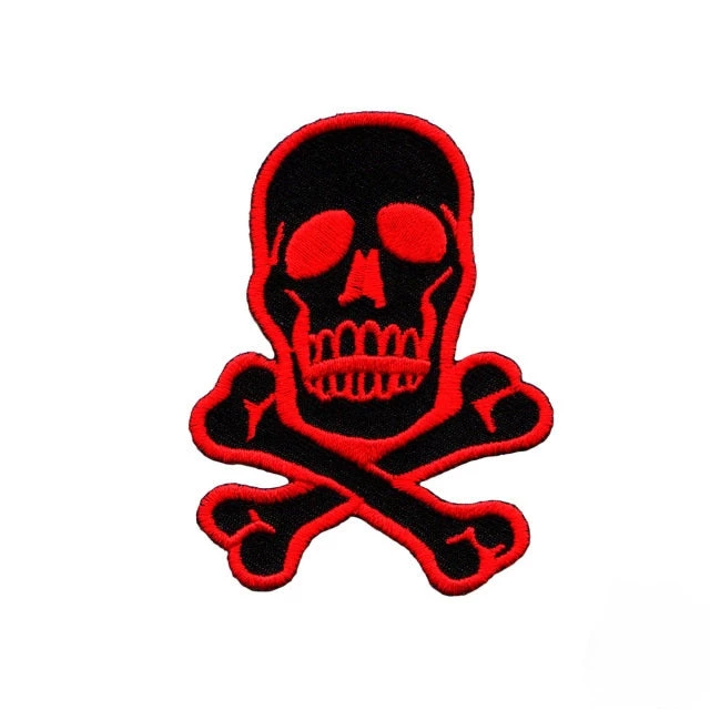 Classic skull and crossed bones patch in black with bright blood red stitching