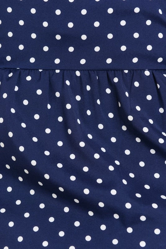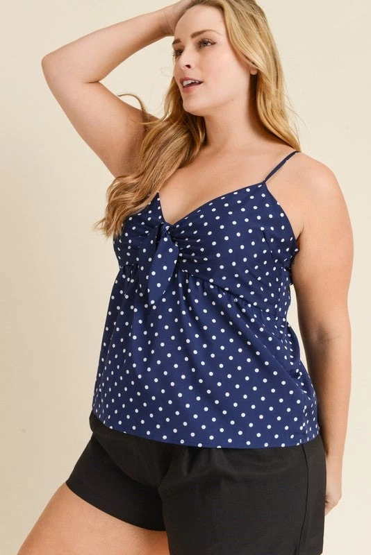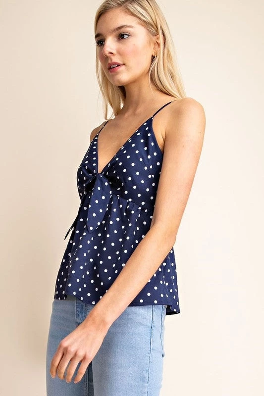 Breezy navy & white polka dot tie-front cami top with adjustable spaghetti straps –perfect for hot summer days!