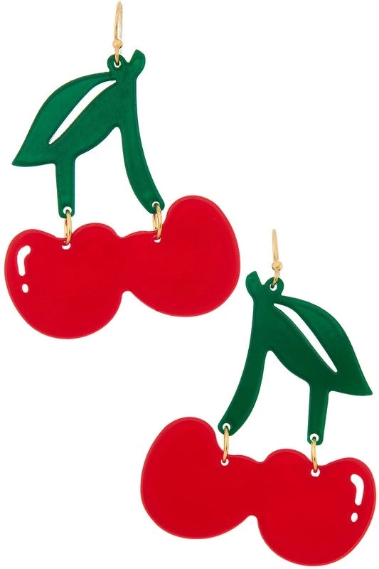 Bright and bold red & green with white reverse segments laser-cut acrylic cherry pair dangle earrings