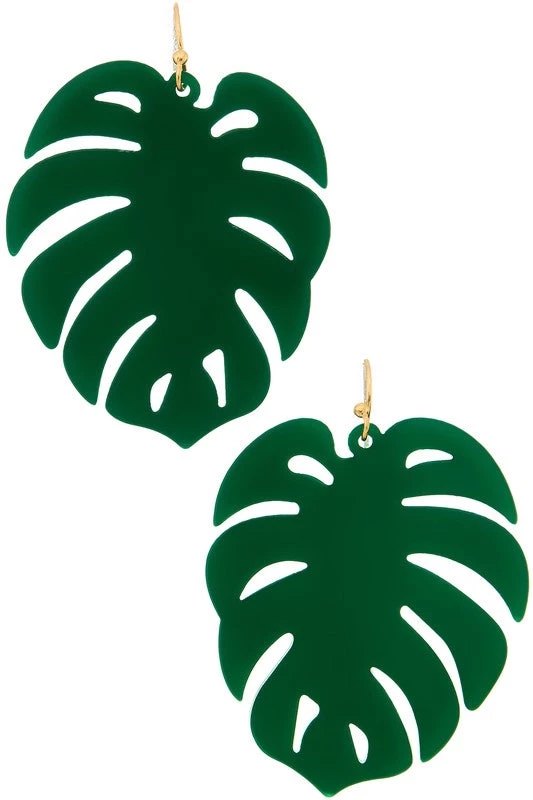 Bold green with white reverse laser-cut acrylic tropical monstera leaf dangle earrings
