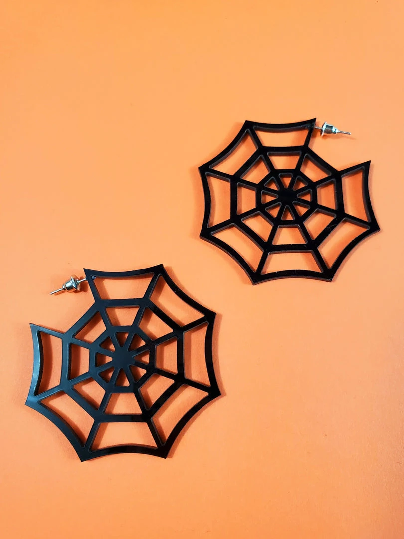 Bold shiny black laser-cut acrylic spiderweb “hoop” earrings