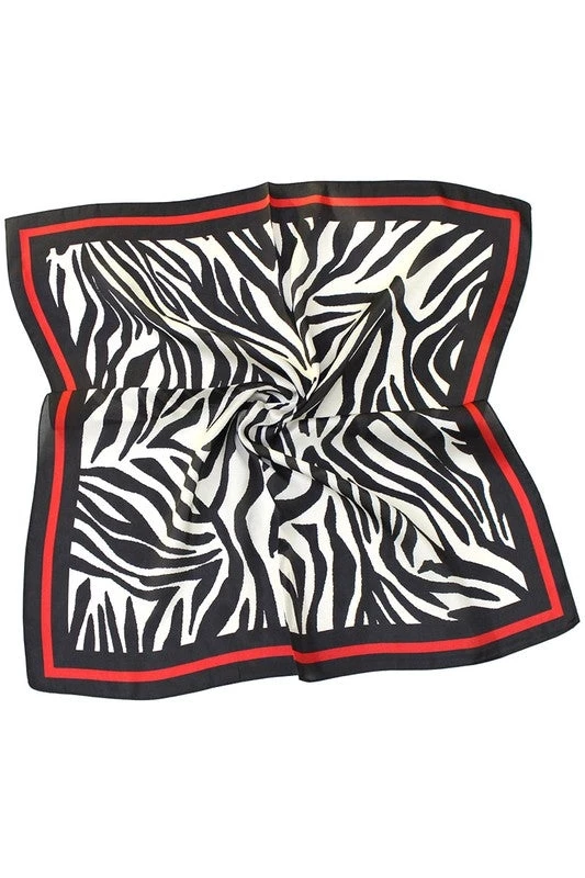 This vintage-inspired satin scarf in black & white zebra print with bright red border stripe is perfect tied in your hair or around your neck.