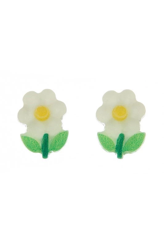 Sweet little 3/8″ x 1/2″ white & yellow resin flower with leaves post earrings.