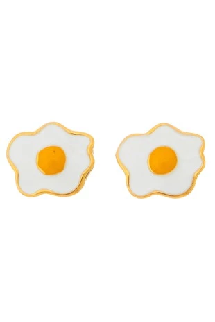 White enameled gold metal sunny side up fried egg post earrings, sturdy and nicely finished
