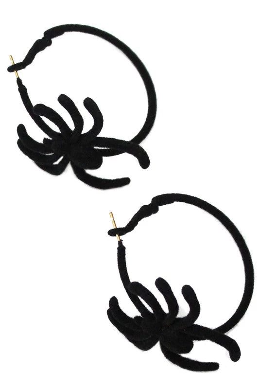 Suede-y soft black flocked metal spider-adorned hoops for your Halloween-all-the-time life! Each earring measures approx.