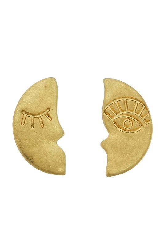 Serene half moon face matte gold metal post earrings –reminiscent, we think, of the lovely animation in Hedwig and the Angry Inch