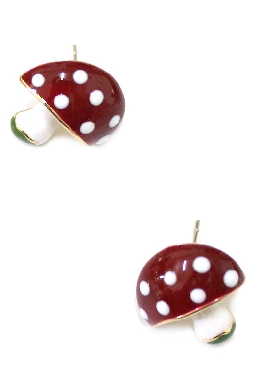 Burgundy, white, and green enameled gold metal toadstool mushroom post earrings, sturdy and nicely finished