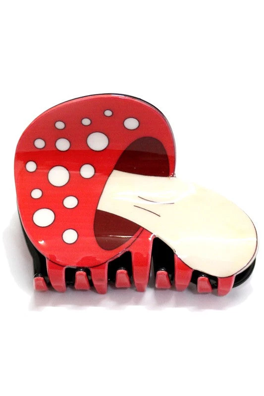 A cute plastic claw style novelty hair clip with cartoony illustrations of a single spotted toadstool mushroom- perfect for keeping cute and cool on hot summer days!