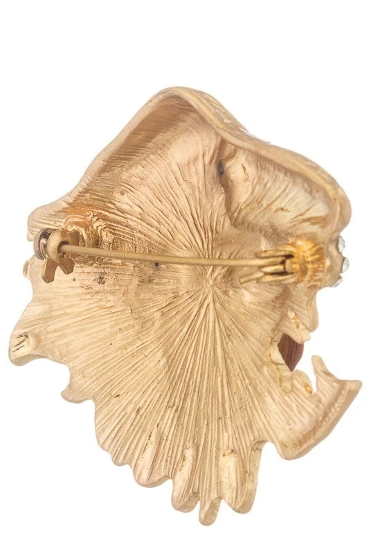 Fancy gold metal tiger head brooch with black enamel and rhinestone details, and sparkly green jewel eye