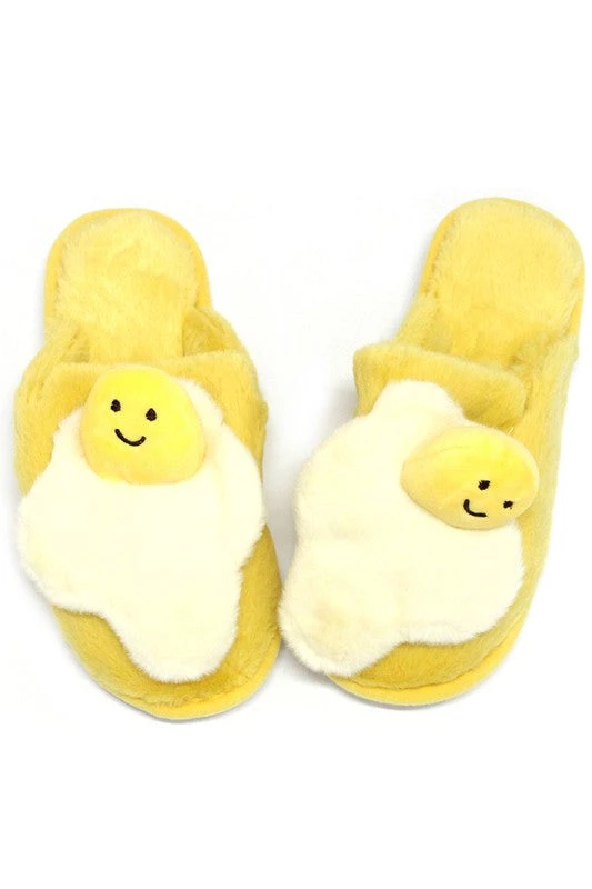 Fuzzy faux fur sunny-side-up egg slippers with happy little yolksÂ