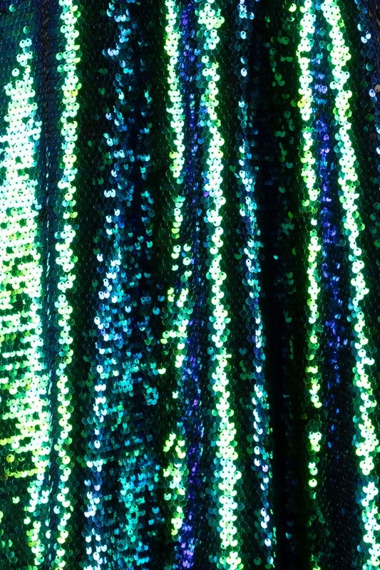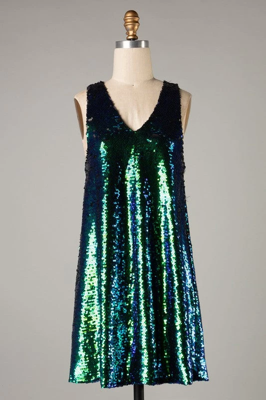 This sassy length stunner is ready to party! Mesmerizing sequins that show alternately as kelly green and royal blue for an overall teal effect, on a simple sleeveless a-line swing dress silhouette with flattering v-neckline.