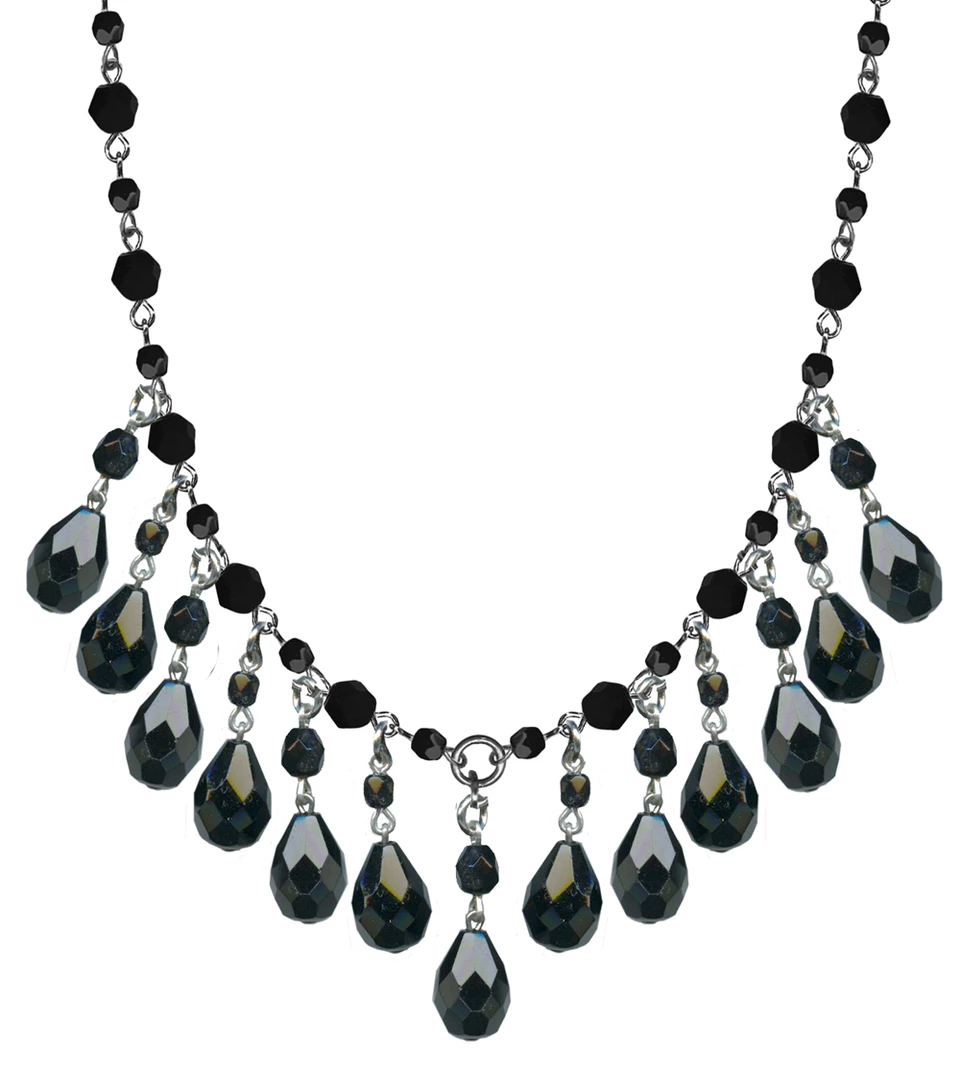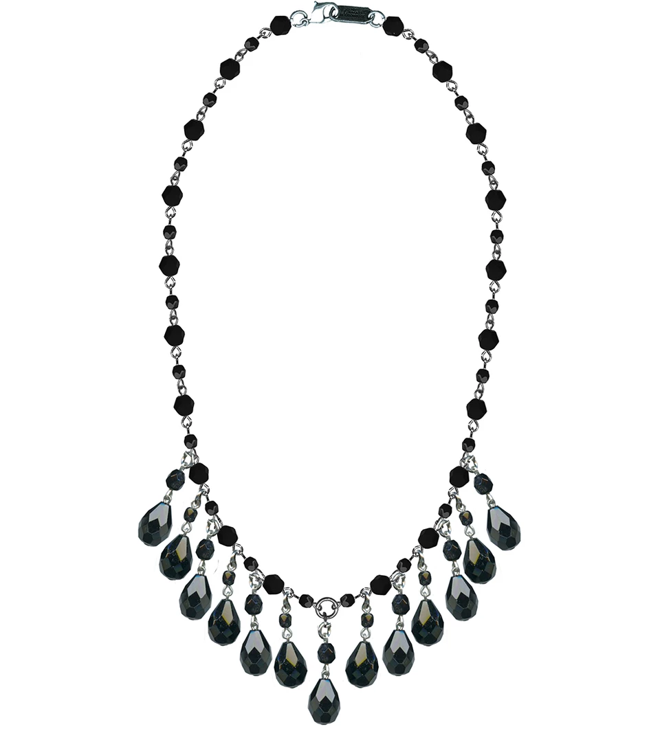 Faceted black glass bead and silver toned metal link necklace with dangling jet black faceted teardrop beads. This bold beauty is a lovely accessory for retro or modern ensembles.