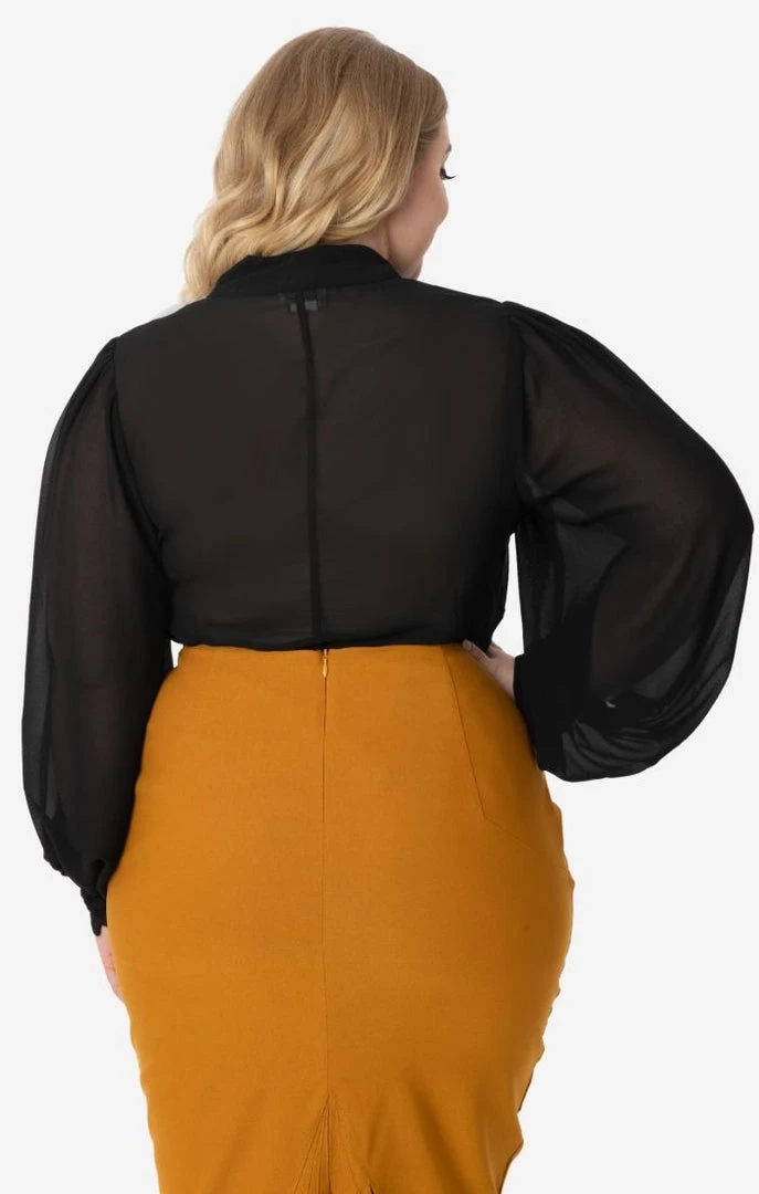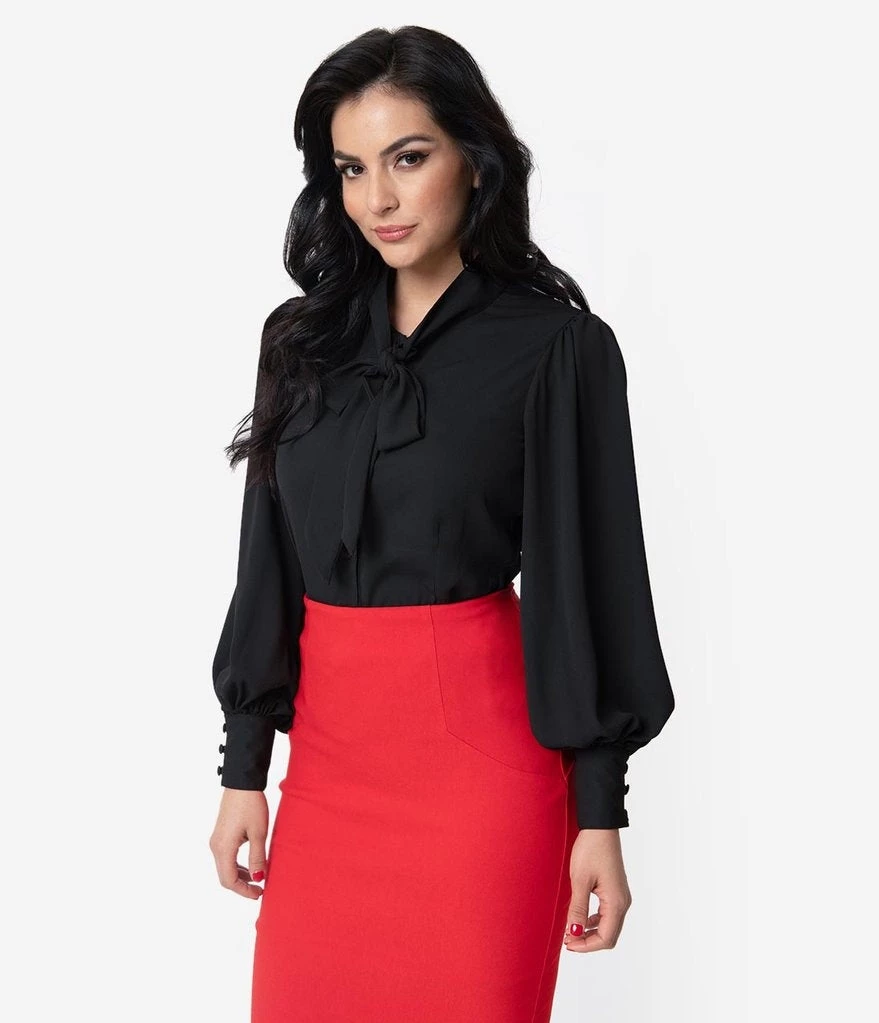 So glamorous! The retro style Gwen Blouse in inky black from Unique Vintage features a nipped in at the waist silhouette with extravagantly full long sleeves that end in 3 1/2″ button closure cuffs, and is topped off with a classic self-tie at the neck. Lovely tucked into you high-waisted favorites, or worn under sleeveless dresses for a smart jumper ensemble.