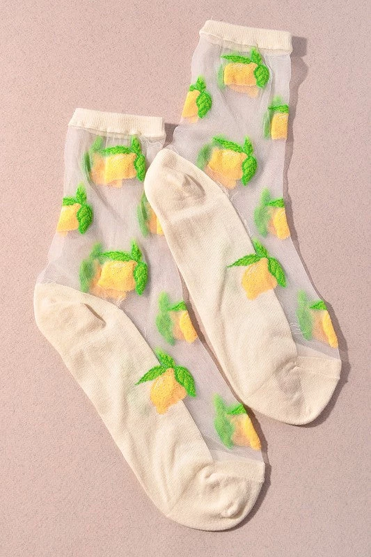Sweet sheer ankle socks with allover solid yellow lemons woven in pattern and solid rich cream colored sole and top band