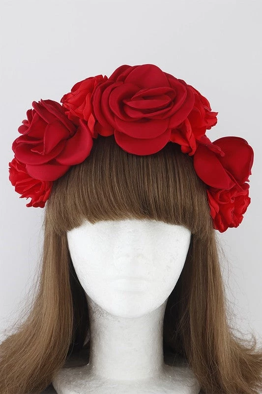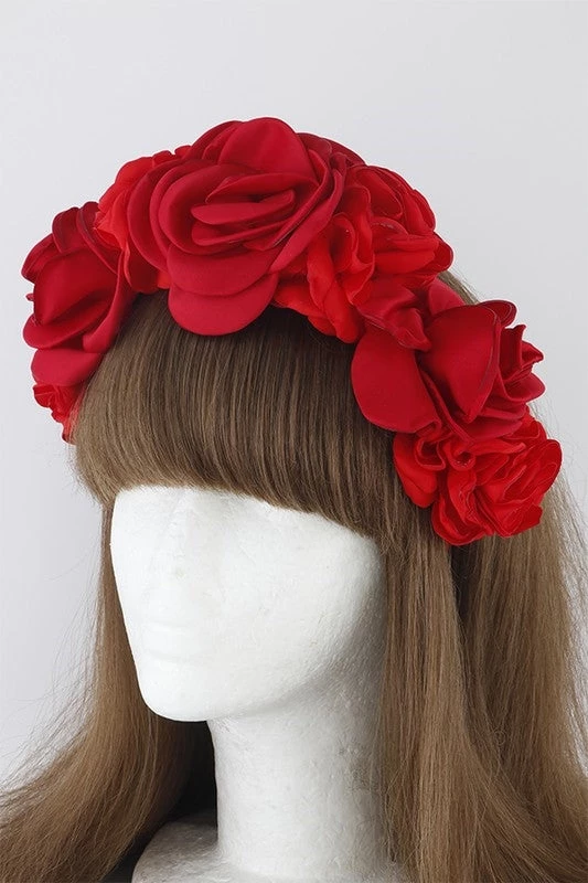 7 big rich alternating dark and bright red fabric roses on red satin covered headband –a very pretty and dramatic topper for so many ensembles!