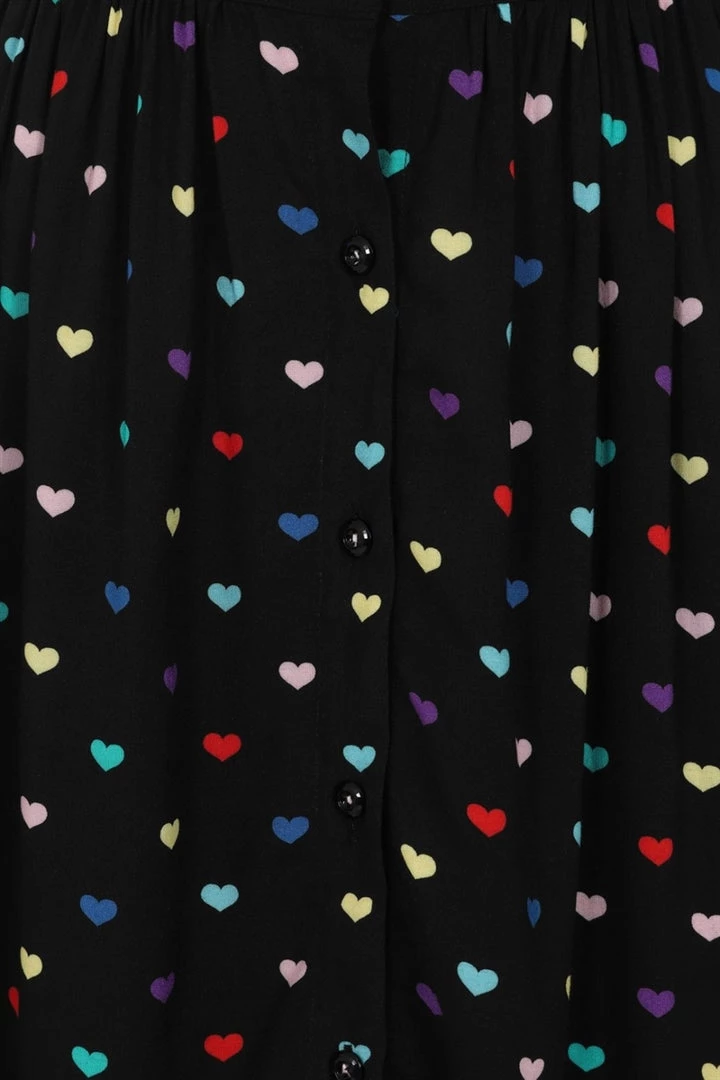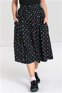 Retro style True Love Skirt from Hell Bunny in black with fun allover multi-color heart “dot” print, features a full gathered silhouette, self waistband with back elasticized panel, button-front closure, and side seam pockets.