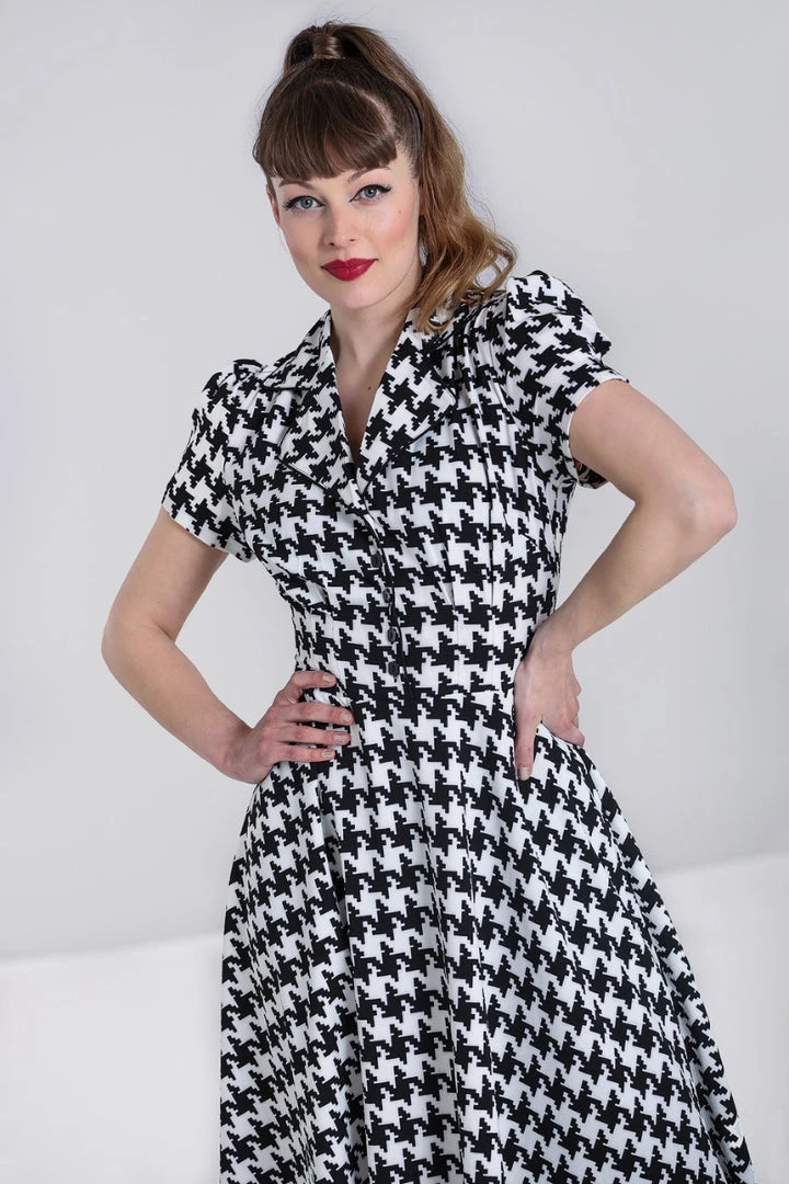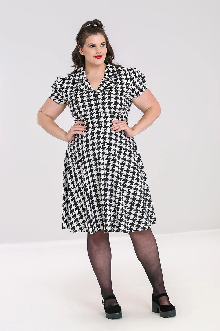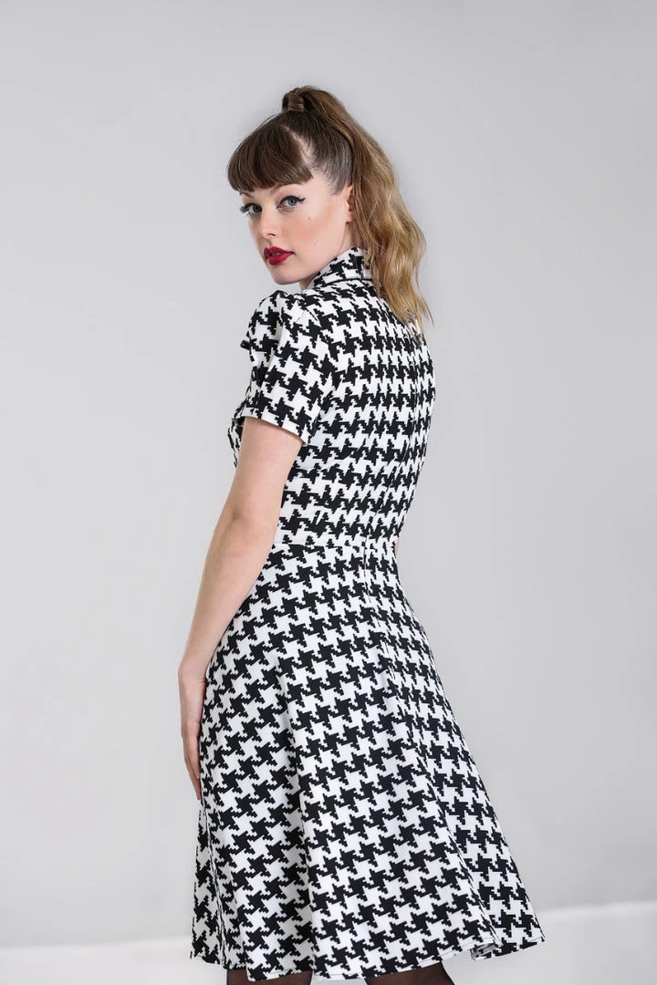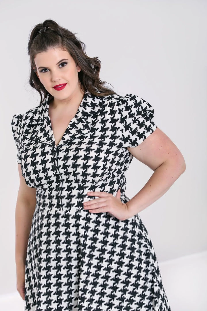 Blake shirtwaist from Hell Bunny in a bold black & ivory houndstooth print. This versatile sweetie features a flattering fit & flare silhouette with square black buttons front closure and notched collar finished with black piping, puffed shoulder short sleeves, and swingy knee length skirt.