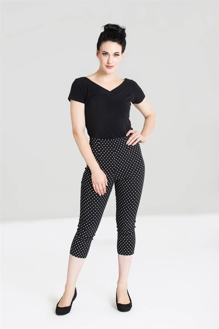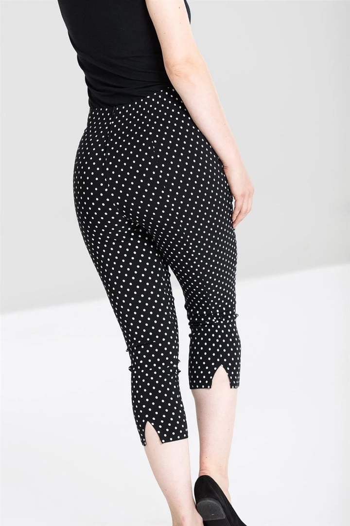 The Kay Capris from Hell Bunny feature a retro high-waist fitted silhouette in classic black & white dot print. This versatile cropped pant can be easily styled sweet worn with flats, or wear them with heels to really show off your dangerous curves!