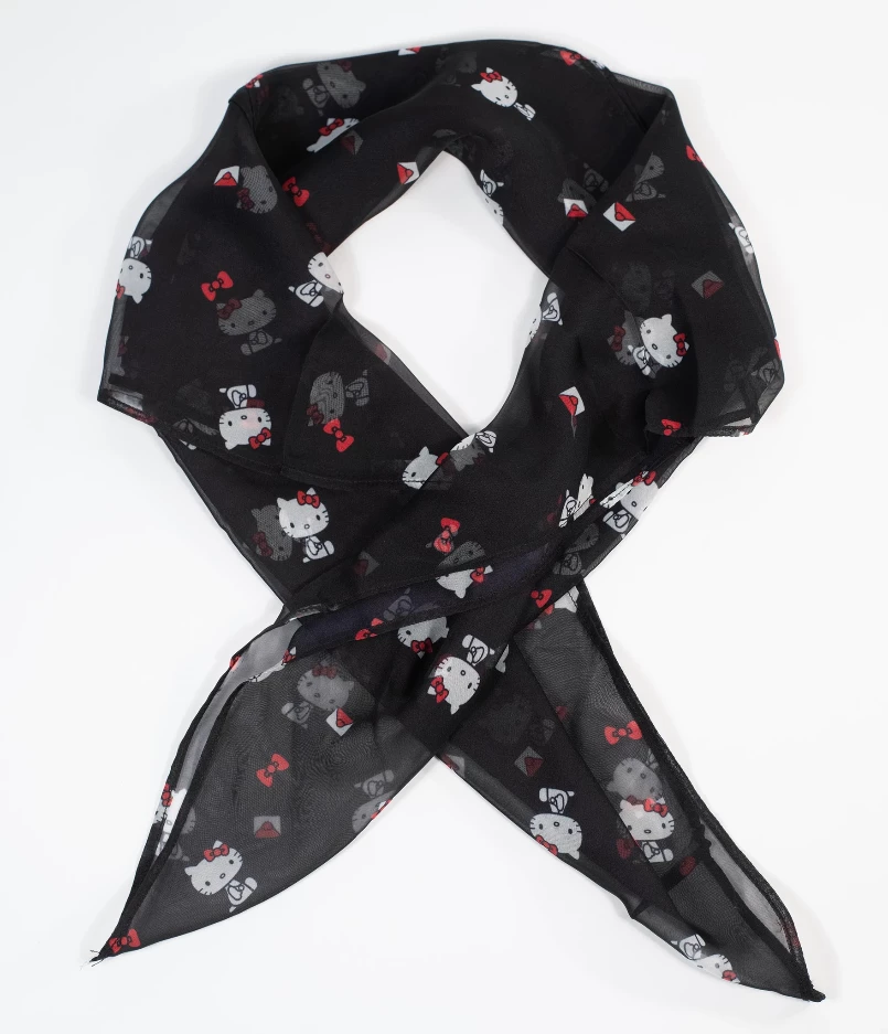 Hello Kitty x Unique Vintage collaboration retro style black background allover Kitty and letters print 28″ square sheer chiffon scarf –cute in your hair or around your neck